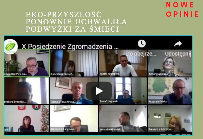 Miało już nie być w tym roku posiedzenia Związku Międzygminnego Eko-Przyszłość, ale jednak się odbyło. Członkowie Zgromadzenia ponownie spotkali się 14 grudnia podczas zdalnych obrad i ponownie głosowali nad uchwałą o podwyżce śmieci, uchylając tym samym poprzednią uchwałę. Tym razem w głosowaniu wzięło udział 10 osób. Wszyscy jednomyślnie zagłosowali za przyjęciem podwyżek. Nawet burmistrz Jolanta Wielgus, która 26 listopada wstrzymała się od głosu, decydując tym samym, że uchwała nie została podjęta.