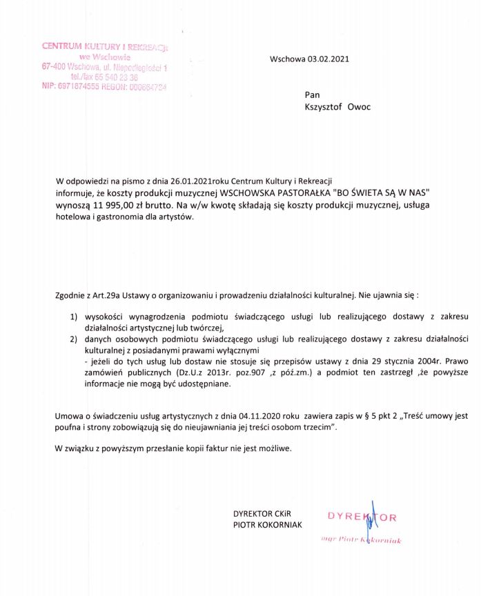 Dzięki uprzejmości portalu wschowa.news, wiadomo już, ile wynosiły koszty produkcji pastorałki ,,Bo święta są w nas”. To kwota – 11 995 złotych. Na tę kwotę złożyły się – zgodnie z tym, co zawiera pismo dyrektora Centrum Kultury i Rekreacji we Wschowie – koszty produkcji muzycznej, usługa hotelowa oraz gastronomia dla artystów.