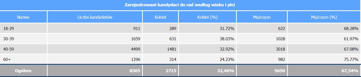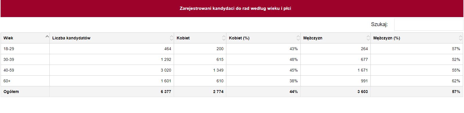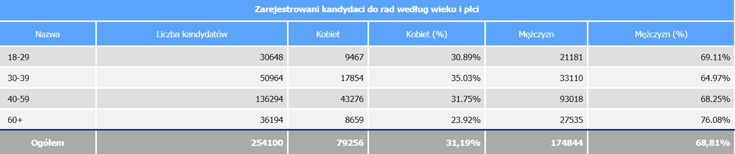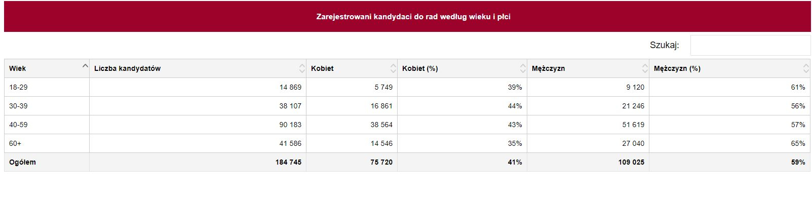 I jest jeszcze jedna rzecz, na którą zwróciłbym uwagę, czyli brak informacji o młodzieży. Być może czytelnik uzna, że naprawdę nie mam się już czego czepiać. Będę się jednak upierał, że stan gminy, to również – poza przemilczanymi przedsiębiorcami – sytuacja młodzieży. Między innymi dlatego, że jak mówi raport, cytuję: społeczeństwo w gminie Wschowa jest społeczeństwem starzejącym się. Młodzi ludzie, jak pokazywałem w artykule na temat średniej wieku Rady Miejskiej, nie są szczególnie zainteresowani sprawami gminy, ich udział w Radzie Miejskiej jest wręcz zerowy. Dla przykładu w 2010 roku na poziomie ogólnopolskim kandydatów, ubiegających się o mandaty w przedziale wiekowym 18-30 lat do wszystkich rad (gminnych, powiatowych i sejmików wojewódzkich) było 30 648 osób. W województwie lubuskim – 911. W 2018 na poziomie ogólnopolskim w przedziale wiekowym 18-29 lat kandydatów było już tylko 14 869 osób, a w województwie lubuskim – 464 osoby. Dane te prezentuję w tabelach, pochodzących ze stron Państwowej Komisji Wyborczej.